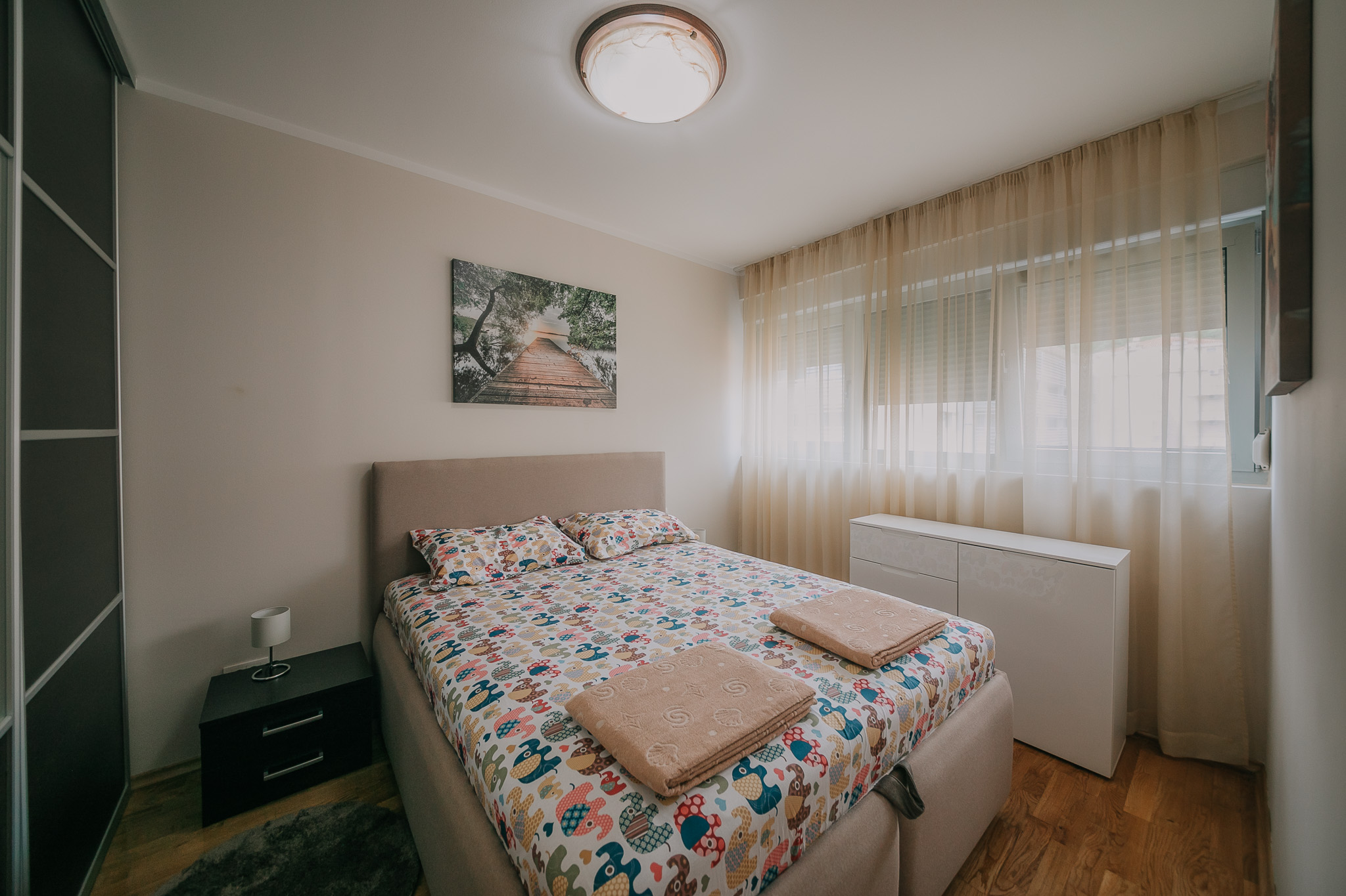 Izdaje se stan koji se nalazi u blizini opstine i sportskog centra, za 4-5 osoba.Stan se sastoji od dvije odvojene spavace sobe sa bracnim krevetima, u dnevnoj sobi je garnitura (trosjed, dvosjed i fotelja), od cega se trosjed otvara, trpezarija, kuhinja i kupatilo. U sklopu zgrade, nalazi se garaza koju gost dobija na koriscenje. Stan posjeduje; wifi, smart TV, masina za pranje vesa, masina za susenje vesa, masina za pranje sudja, mikrotalasna, klima uredjaj, peskari, posteljina, sudje.